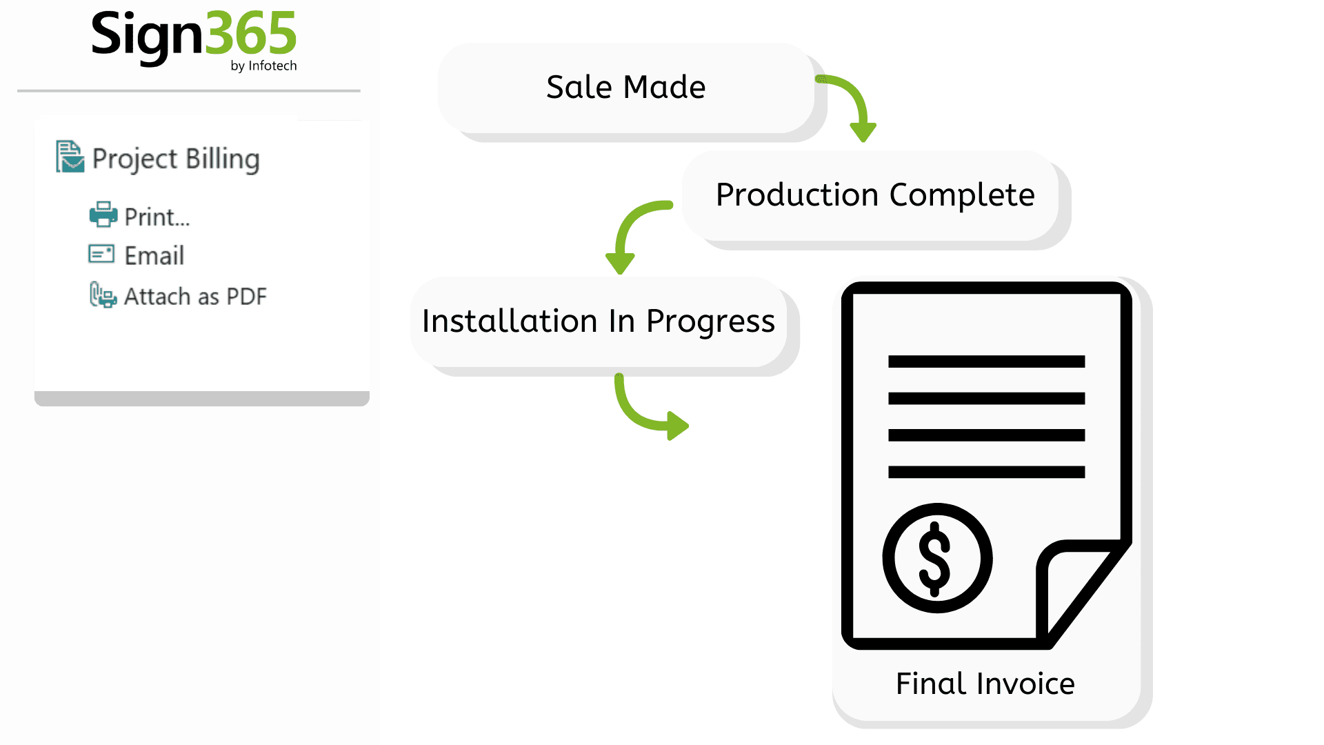 Execute the work with full visibility from sale to final invoice. Sign365 keeps production, installation, and billing in sync.