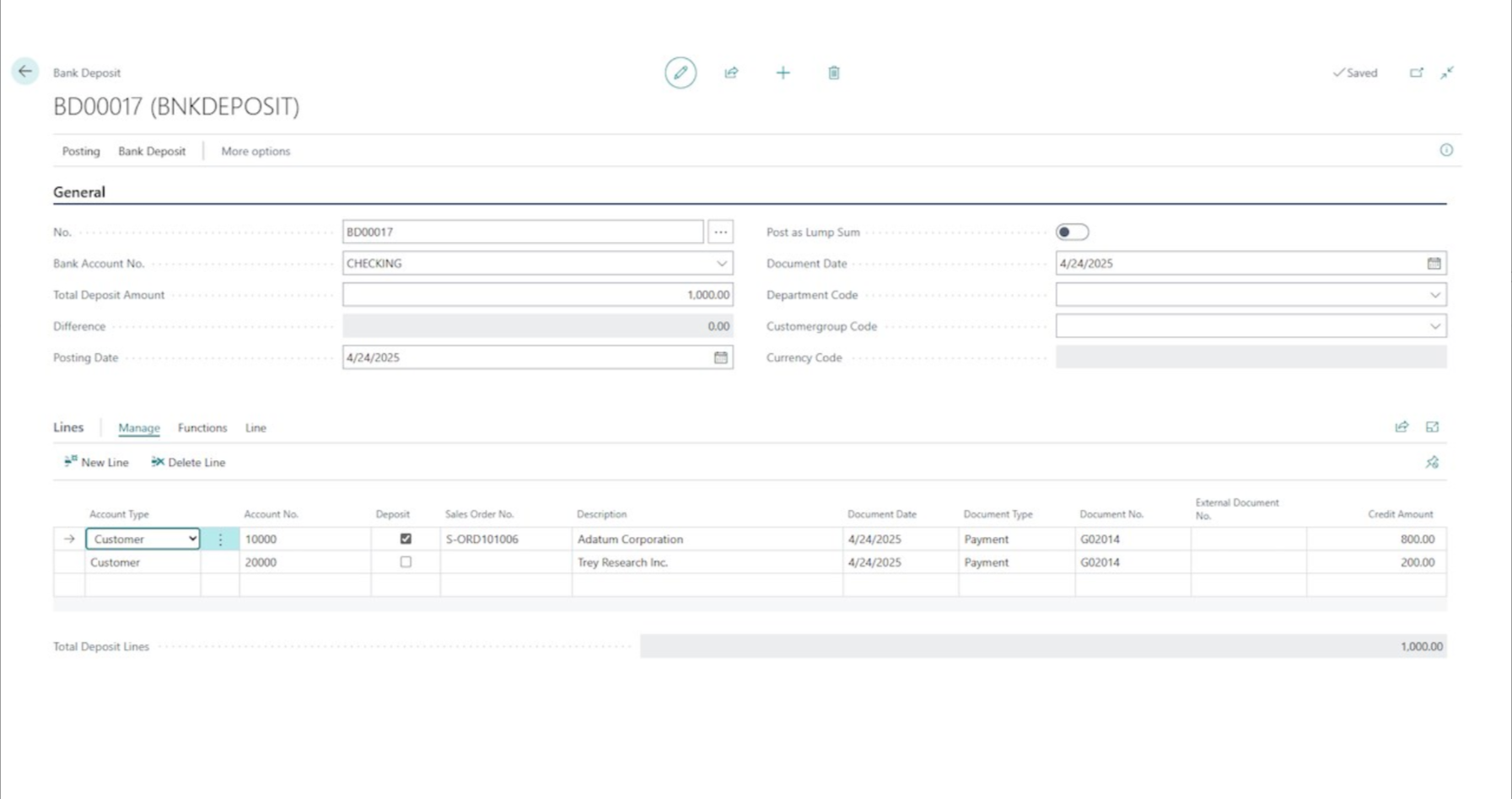 - Full audit trail Deposits can be linked to originating sales orders and remain traceable through posting.
